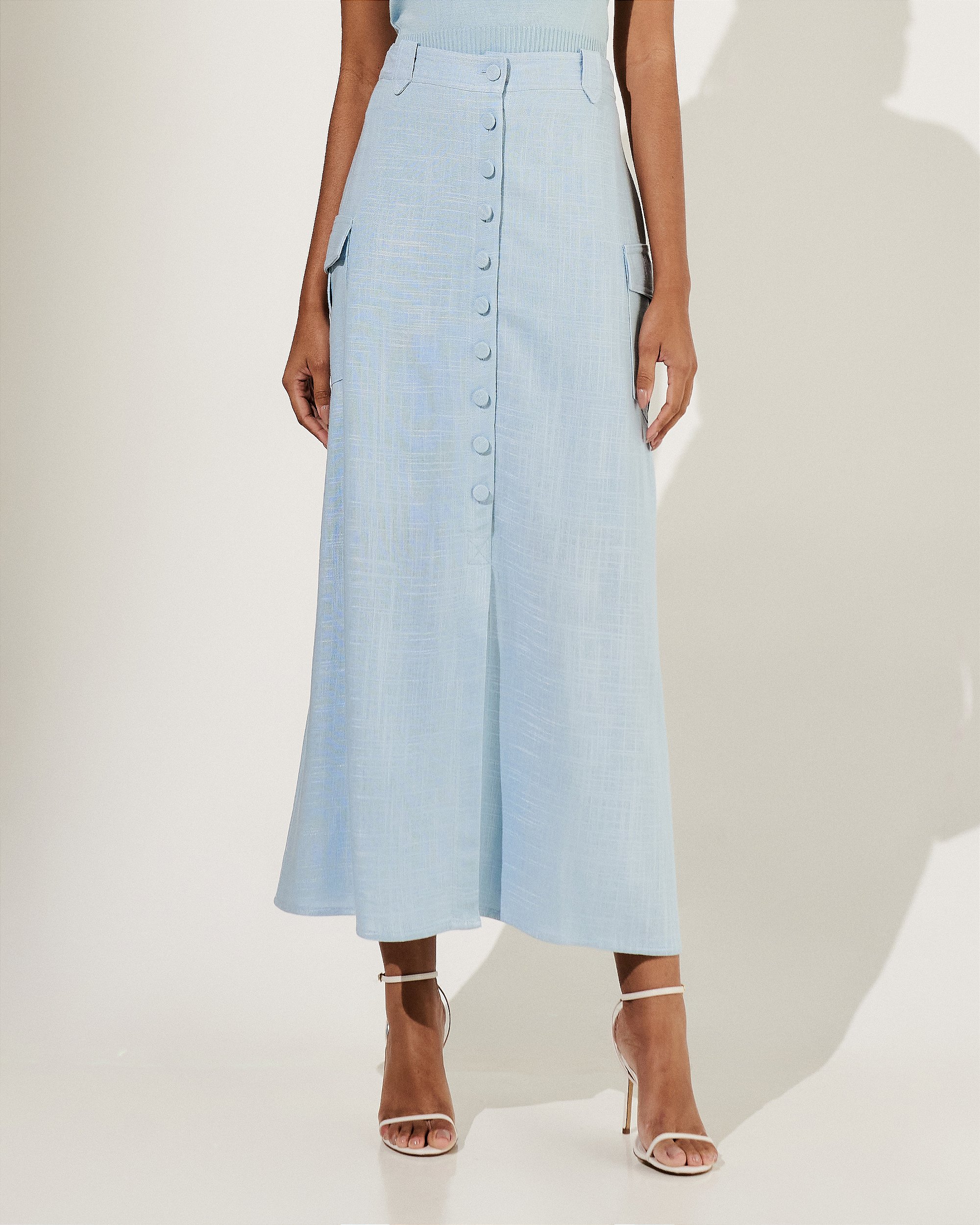 Saia confeccionada em viscolinho. Comprimento midi. Cintura alta, botões encapados na frente e nos bolsos laterais.